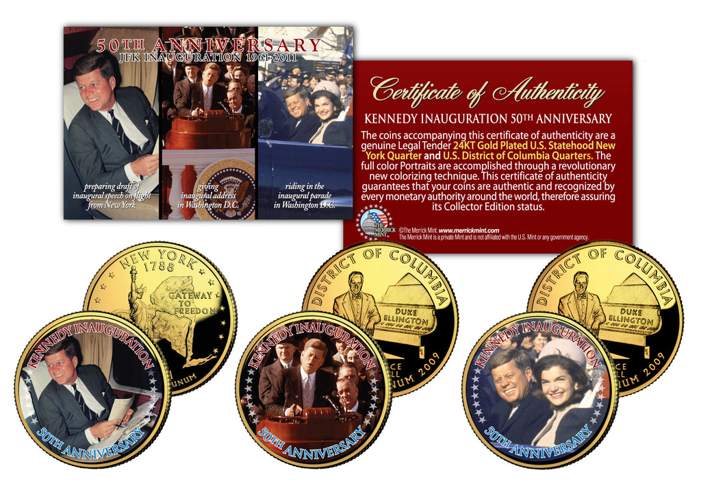Here is your opportunity to own or gift the KENNEDY INAUGURATION 50TH ANNIVERSARY coin set. This complete 3-coin set of colorized 24KT gold plated quarters are Genuine Legal Tender of the United States, which have been layered in Genuine 24 Karat Gold and then enhanced with beautiful colorized images, marking 50th Anniversary of the John F. Kennedy Presidential Inauguration, 1961-2011. One of the coins is a 2001 New York Statehood Quarter and two of the coins are 2009 District of Columbia Quarters. These coins have been colorized using a unique painstaking multicolor authentic process by the Merrick Mint. Colorizing coins involves the unique application of special inks directly to the surface of a coin that achieves a level of detail, color saturation, and durability that is #1 in the industry. The result is an everlasting colorized coin collectible of ultra-high quality. The 3-coin set comes with a certificate of authenticity with each coin coming in a premium coin capsule. The three images on the 3-coin set include JFK: preparing draft of inaugural speech on flight from New York, giving inaugural address in Washington D.C., and riding in the inaugural parade in Washington D.C.