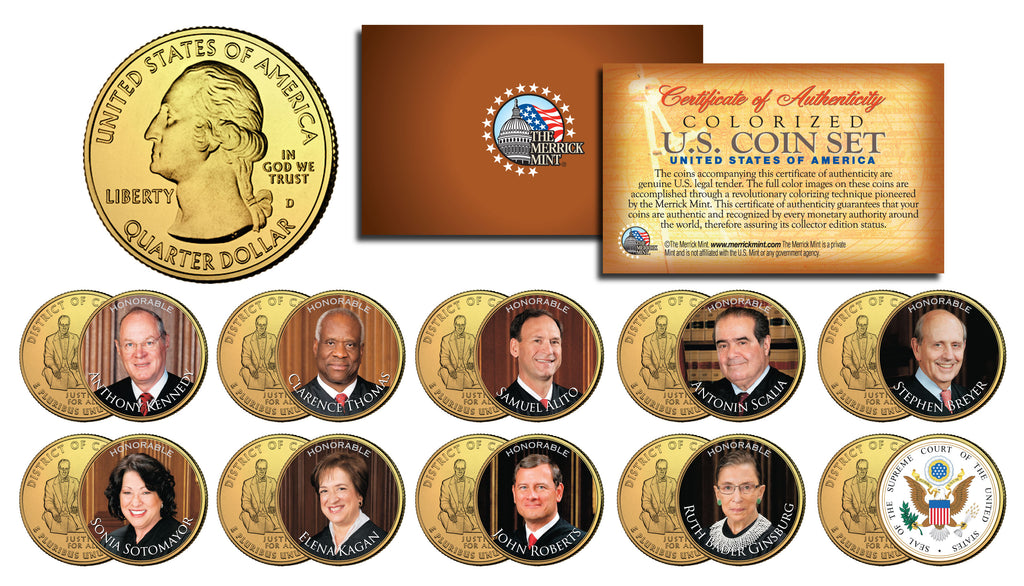 The Supreme Court of the United States is the highest judicial body in the United States. Here is your chance to own a complete set of ten (10) 24KT Gold Plated and colorized 2009 District of Columbia Quarters U.S. Coins featuring 9 Justices of the SUPREME COURT of the United States plus the court’s seal, in this Limited Edition Coin Series. These high-quality, genuine Legal Tender United States coins have been layered in Genuine 24 Karat Gold, and then colorized using a unique painstaking multicolor authentic process. Colorizing coins involves the unique application of special inks directly to the surface of a coin that achieves a level of detail, color saturation, and durability that is #1 in the coin industry. The result is an everlasting colorized coin collectible of ultra-high quality. Each 24KT Gold Plated coin features an emblematic design of the District of Columbia on the reverse and a colorized image of a Justice or the Supreme Court Seal on the obverse (portrait of George Washington design). Each coin comes in a premium coin capsule with a Certificate of Authenticity. REGULAR PRICE of this 10-coin set is $69.95. GREAT SAVINGS BY BUYING HERE NOW!!!