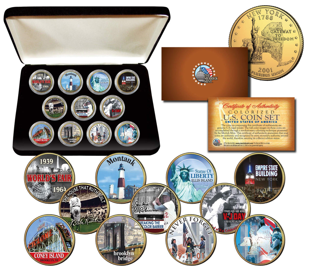 Here is your chance to own the NEW YORK STATE COLLECTION complete set of eleven (11) 24KT Gold Plated and colorized 2001 New York Statehood Quarters U.S. Coins featuring noteworthy events and places in New York State. The 11-coin set includes: World’s Fair, Montauk, Statue of Liberty/Ellis Island, Empire State Building, House that Ruth Built, Jackie Robinson, V-J Day, Coney Island, Brooklyn Bridge, 9/11 plus a hologram enhanced coin. The hologram enhanced coin is enhanced on the reverse side and the other 10 coins are colorized on the obverse side. These high-quality, genuine Legal Tender United States coins have been layered in Genuine 24 Karat Gold, and then colorized using a unique painstaking multi-color authentic process by the Merrick Mint. Colorizing coins involves the unique application of special inks directly to the surface of a coin that achieves a level of detail, color saturation, and durability that is #1 in the coin industry. The result is an everlasting colorized coin collectible of ultra-high quality. Each 24KT Gold Plated coin features an emblematic design of New York State on the reverse and George Washington design on the obverse. Each coin comes in a premium coin capsule. Each set comes with a deluxe black felt coin display metal gift box. The 11-coin set comes with a Certificate of Authenticity to guarantee that your coins are authentic and recognized by every monetary authority around the world, assuring its Collector Edition status.