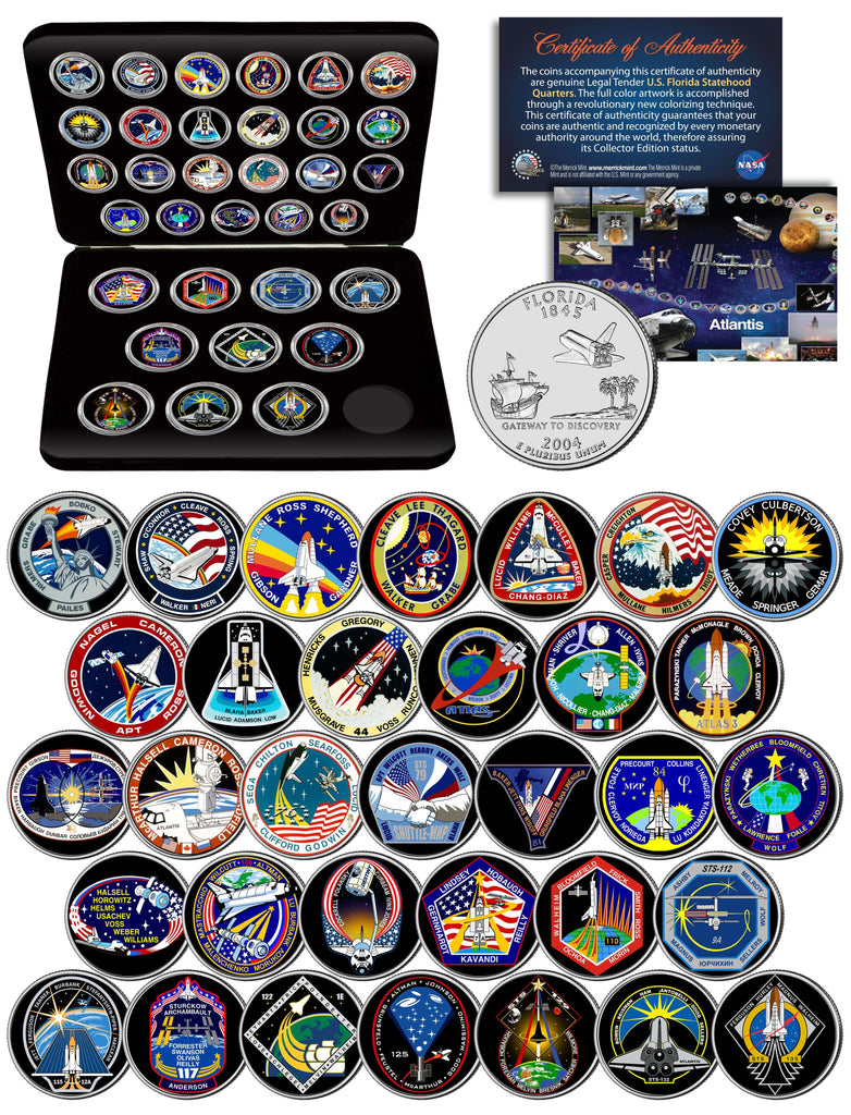 The Space Shuttle Atlantis was the fourth operational and the second-to-last Space Shuttle built. Here is your chance to own a complete set of thirty-three (33) colorized 2004 Florida Statehood Quarters U.S. Coins of the SPACE SHUTTLE ATLANTIS MISSIONS. These high-quality, genuine Legal Tender United States coins have been colorized using a unique painstaking multicolor authentic process by the Merrick Mint. Colorizing coins involves the unique application of special inks directly to the surface of a coin that achieves a level of detail, color saturation, and durability that is #1 in the coin industry. The result is an everlasting colorized coin collectible of ultra-high quality. Each coin features an emblematic design of Florida State on the reverse and colorized mission insignia image on the obverse (portrait of George Washington design). Each coin comes in a premium coin capsule. The 33-coin set comes with a Certificate of Authenticity to guarantee that your coins are authentic and recognized by every monetary authority around the world, assuring its Collector Edition status.