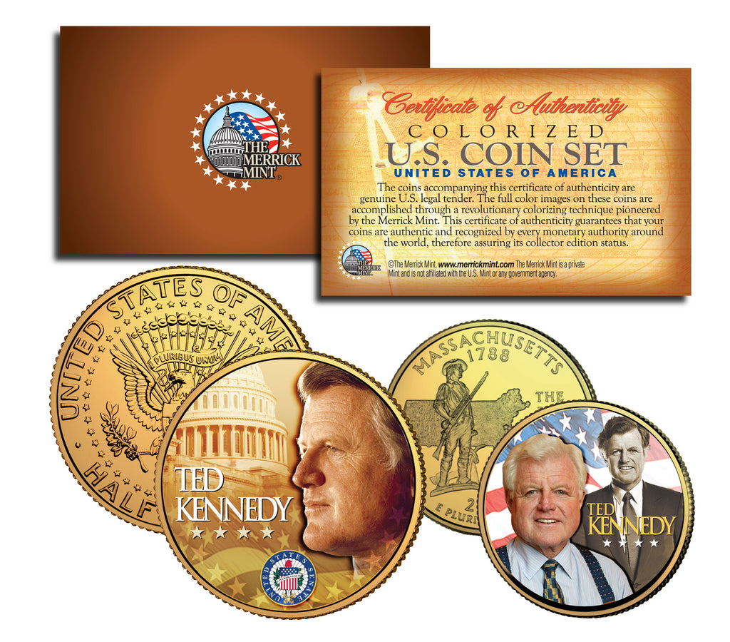 This TED KENNEDY 2-coin complete set is a treasured collectible. Coins are Genuine Authentic Legal Tender of the United States, which have been layered in Genuine 24 Karat Gold, and then beautifully enhanced with colorized images. The 2-coin set includes a 24-Karat Gold Plated JFK Kennedy Half Dollar coin plus a 24-Karat Gold Plated 2000 Massachusetts Statehood quarter. Colorizing coins involves the unique application of special inks directly to the surface of a coin that achieves a level of detail, color saturation, and durability that is #1 in the coin industry. The result is an everlasting colorized coin collectible of ultra-high quality. Each coin comes in a premium coin capsule. The set comes with a Certificate of Authenticity to guaranty that your coins are authentic and recognized by every monetary authority around the world, assuring its Collector Edition status.