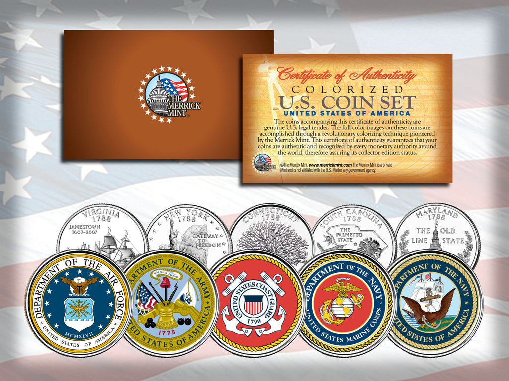 The United States Armed Forces are the military forces of the United States of America. They consist of the Army, Navy, Marine Corps, Air Force, and Coast Guard. This UNITED STATES ARMED FORCES QUARTERS SERIES complete 5-coin set is a treasured collectible. Here is your chance to own a set of five (5) beautifully colorized US Statehood Quarters Coins featuring the five branches of US Armed Forces: Army (NY), Navy (MD), Marine Corps (SC), Air Force (VA), and Coast Guard (CT). Each collectible Armed Forces branch coin is matched to their Academy’s state Statehood Quarter. These high-quality, genuine Legal Tender United States coins have been colorized using a unique painstaking multicolor authentic process by The Merrick Mint. Colorizing coins involves the unique application of special inks directly to the surface of a coin that achieves a level of detail, color saturation, and durability that is #1 in the coin industry. The result is an everlasting colorized coin collectible of ultra-high quality. The set comes with a Certificate of Authenticity to guaranty that your coins are authentic and recognized by every monetary authority around the world, assuring its Collector Edition status. Each coin comes in a premium coin capsule.