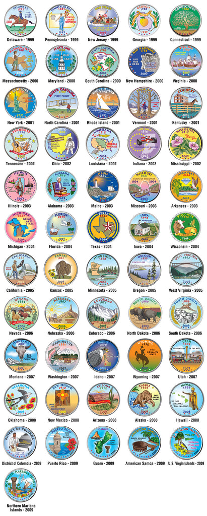 Launched in 1999, the United States 50 State Quarters Program was a 10-year initiative that honored each of the nation's states in the order that they ratified the Constitution or were admitted into the Union. The 2009 DC and US Territories 6 Quarters U.S. Coins followed. Each quarter was produced for about 10 weeks and never produced again. Here is your chance to own a complete set of fifty-six (56) beautifully colorized United States Statehood/DC and US Territories Quarters Coins featuring all 50 states and the 6 DC/US Territories. Each coin is beautifully enhanced on the reverse in permanent full-color by the Merrick Mint to highlight the original design using a unique colorizing process, which involves the application of special inks directly to the surface of a coin. The result is an everlasting colorized coin collectible of ultra-high quality that is #1 in the industry. Each coin features a unique state/DC/territory design on the reverse and a common obverse with portrait of George Washington. Each coin is genuine legal tender of the United States and comes in an acrylic coin holder and includes a Full Color 2-sided Certificate of Authenticity. The State Quarters Program was the most popular commemorative coin program in United States history. REGULAR PRICE of this 56-coin complete set is $229. GREAT SAVINGS BY BUYING HERE NOW!!!