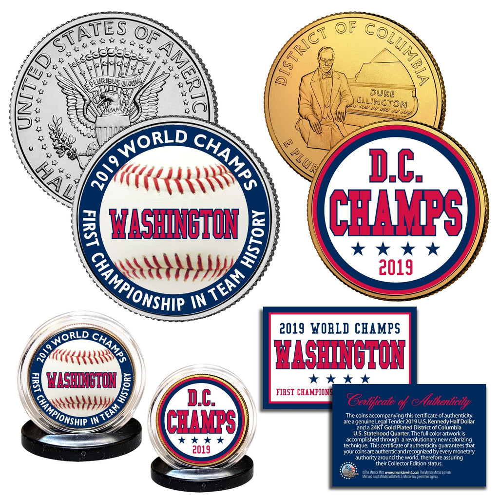 Here is your chance to own a Washington D.C. Champs set of two (2) colorized United States coins. This 2-coin set includes a beautifully colorized 2019 JFK Kennedy Half Dollar which features Washington as 2019 World Champions (1st in Team History). The second coin is a 24KT Gold colorized District of Columbia Quarter featuring the saying "D.C. Champs 2019". These high-quality, genuine Legal Tender United States coins have been colorized using a unique painstaking multicolor authentic process by the Merrick Mint. The 2-coin set comes with a Certificate of Authenticity to guarantee that your coins are authentic and recognized by every monetary authority around the world, assuring its Collector Edition status.