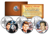 Here is your opportunity to own or gift the JOHN F. KENNEDY 3-coin set. This complete 3-coin set of colorized statehood quarters are Genuine Legal Tender of the United States, which have been enhanced with beautiful colorized images of John F. Kennedy, John F. Kennedy Junior, and Jacqueline Kennedy Onassis. One of the coins is a 2001 New York Statehood Quarter and two of the coins are 2000 Massachusetts Statehood Quarters. These coins have been colorized using a unique painstaking multicolor authentic process by the Merrick Mint. Colorizing coins involves the unique application of special inks directly to the surface of a coin that achieves a level of detail, color saturation, and durability that is #1 in the industry. The result is an everlasting colorized coin collectible of ultra-high quality. The 3-coin set comes with a certificate of authenticity with each coin coming in a premium coin capsule.