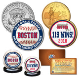 Here is your chance to own a Boston Red Sox 2018 World Champs set of two (2) colorized United States coins. This 2-coin set includes a beautifully colorized 2018 JFK Kennedy Half Dollar which features the Boston Red Sox as 2018 World Champions. The second coin is a 24KT Gold colorized Massachusetts Statehood Quarter featuring Boston's 119 WINS! These high-quality, genuine Legal Tender United States coins have been colorized using a unique painstaking multicolor authentic process by the Merrick Mint. The 2-coin set comes with a Certificate of Authenticity to guarantee that your coins are authentic and recognized by every monetary authority around the world, assuring its Collector Edition status.