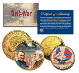 This CIVIL WAR 2-coin complete set is a treasured collectible. Coins are Genuine Authentic Legal Tender of the United States, which have been layered in Genuine 24 Karat Gold, and then beautifully enhanced with colorized images. The 2-coin set includes a 24-Karat Gold Plated JFK Kennedy Half Dollar coin plus a 24-Karat Gold Plated 2000 South Carolina Statehood Quarter. Colorizing coins involves the unique application of special inks directly to the surface of a coin that achieves a level of detail, color saturation, and durability that is #1 in the coin industry. The result is an everlasting colorized coin collectible of ultra-high quality. Each coin comes in a premium coin capsule. The set comes with a Certificate of Authenticity to guarantee that your coins are authentic and recognized by every monetary authority around the world, assuring its Collector Edition status.