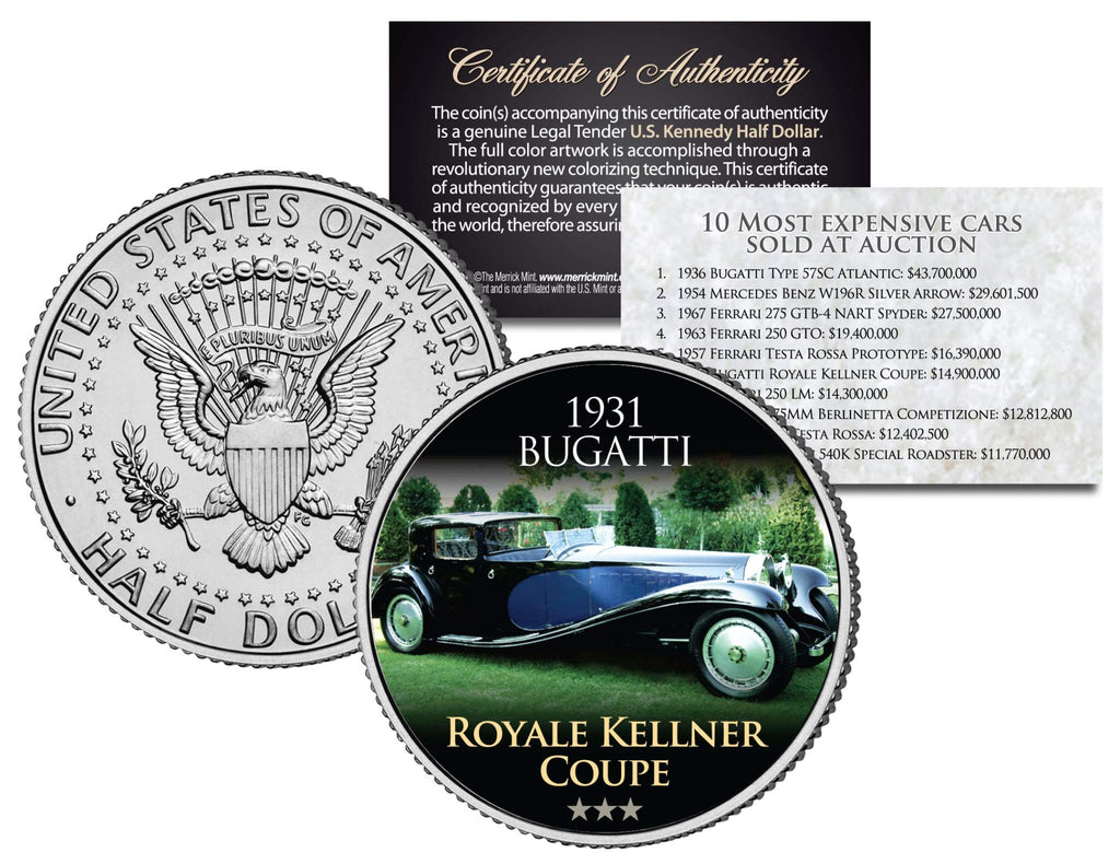 Here is your opportunity to own or gift the “MOST EXPENSIVE CARS SOLD AT AUCTION - 1931 BUGATTI – ROYALE KELLNER COUPE” U.S. colorized JFK Kennedy Half Dollar U.S. Coin, which has been enhanced with a beautifully colorized image by the Merrick Mint. Each coin comes in a premium coin capsule with a full color Certificate of Authenticity to guarantee that your coin is authentic and recognized by every monetary authority around the world, assuring its Collector Edition status. This Legal Tender United States coin has been colorized with an application of special inks directly to the surface of the coin, using a unique and painstakingly multicolor coin process, which achieves a level of detail, color saturation, and durability that is #1 in the coin industry. The result is an everlasting colorized coin collectible of ultra-high quality. The Kennedy half dollar is a U.S. fifty cent coin with coin year and mint marks chosen at random.