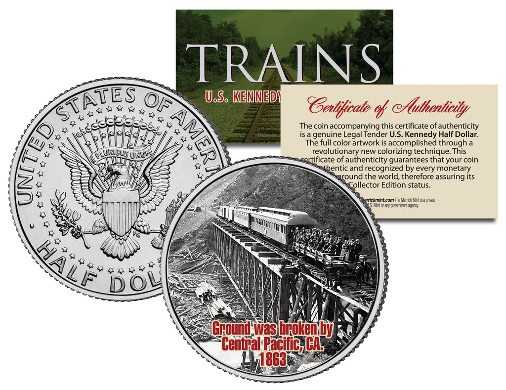 CENTRAL PACIFIC GROUNDBREAKING 1863 - Famous Trains - JFK Kennedy Half Dollar U.S. Colorized Coin