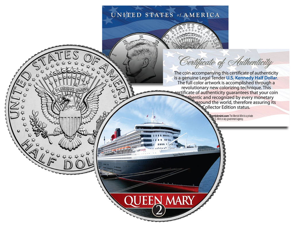 Here is your opportunity to own or gift the “QUEEN MARY 2” colorized JFK Kennedy Half Dollar U.S. Coin, which has been enhanced with a beautifully colorized image by the Merrick Mint. Each coin comes in a premium coin capsule with a full color Certificate of Authenticity to guarantee that your coin is authentic and recognized by every monetary authority around the world. This Legal Tender United States coin has been colorized with an application of special inks directly to the surface of the coin, using a unique and painstakingly multicolor coin process, which achieves a level of detail, color saturation, and durability that is #1 in the coin industry. The result is an everlasting colorized coin collectible of ultra-high quality. The Kennedy half dollar is a U.S. fifty cent coin with coin year and mint marks chosen at random.