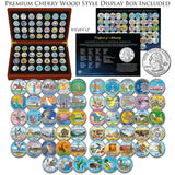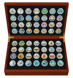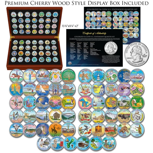 1999-2008 Statehood and 2009 D.C. & U.S. Territories. Launched in 1999, the United States 50 State Quarters Program was a 10-year initiative that honored each of the nation's states in the order that they ratified the Constitution or were admitted into the Union. The 2009 DC and US Territories 6 Quarter Coins followed. Each quarter was produced for about 10 weeks and never produced again. Here is your chance to own a complete set of all fifty-six (56) beautifully colorized United States Statehood Quarter Coins featuring all 50 states and the 6 DC/US Territories. Each coin is beautifully enhanced on the reverse in permanent full-color by the Merrick Mint to highlight the original design using a unique colorizing process, which involves the application of special inks directly to the surface of a coin. The result is an everlasting colorized coin collectible of ultra-high quality that is #1 in the industry. Each coin features a unique State design on the reverse and a common obverse with portrait of George Washington. Each coin is genuine legal tender of the United States and comes in an acrylic coin holder and includes a Full Color 2-sided Certificate of Authenticity. Each set comes beautifully packaged in a magnificent ultra high-end premium deluxe cherry wood style display box. The State Quarters Program was the most popular commemorative coin program in United States history. REGULAR PRICE of this 56-coin complete set with box is $299. GREAT SAVINGS BY BUYING HERE NOW!!!
