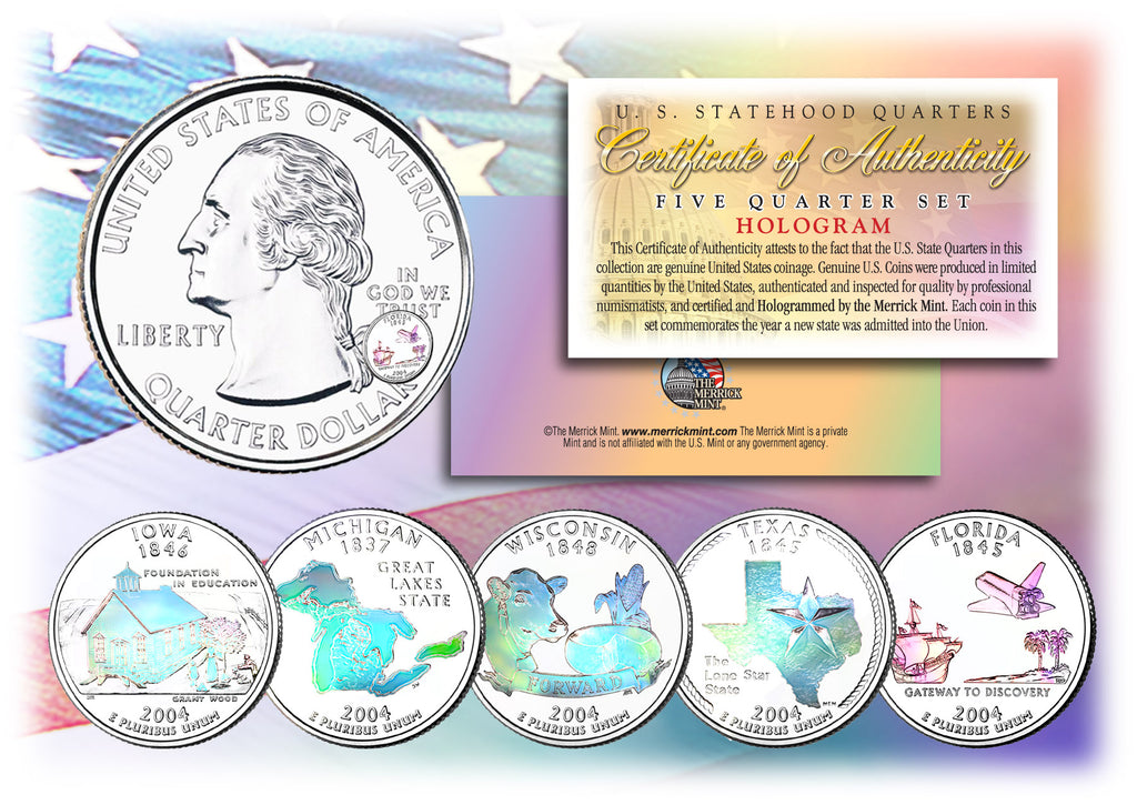 Here is your chance to own a complete set of five (5) hologram enhanced 2004 Statehood Quarters U.S. Coins featuring five states: MI, FL, TX, IA, WI. Each coin is beautifully enhanced on the reverse with a permanent hologram by the Merrick Mint to highlight the original design using a unique authentic process. The result is an everlasting hologram coin collectible of ultra-high quality that is #1 in the industry. Each coin features a unique state design on the reverse and a common obverse with portrait of George Washington. Each coin is genuine legal tender of the United States and comes in an acrylic coin holder and includes a Full Color 2-sided Certificate of Authenticity. The State Quarters Program was the most popular commemorative coin program in United States history.