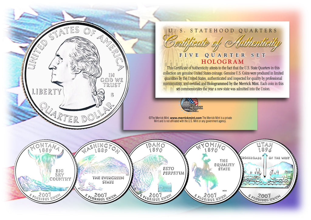 Here is your chance to own a complete set of five (5) hologram enhanced 2007 Statehood Quarters U.S. Coins featuring five states: MT, WA, ID, WY, UT. Each coin is beautifully enhanced on the reverse with a permanent hologram by the Merrick Mint to highlight the original design using a unique authentic process. The result is an everlasting hologram coin collectible of ultra-high quality that is #1 in the industry. Each coin features a unique state design on the reverse and a common obverse with portrait of George Washington. Each coin is genuine legal tender of the United States and comes in an acrylic coin holder and includes a Full Color 2-sided Certificate of Authenticity. The State Quarters Program was the most popular commemorative coin program in United States history.