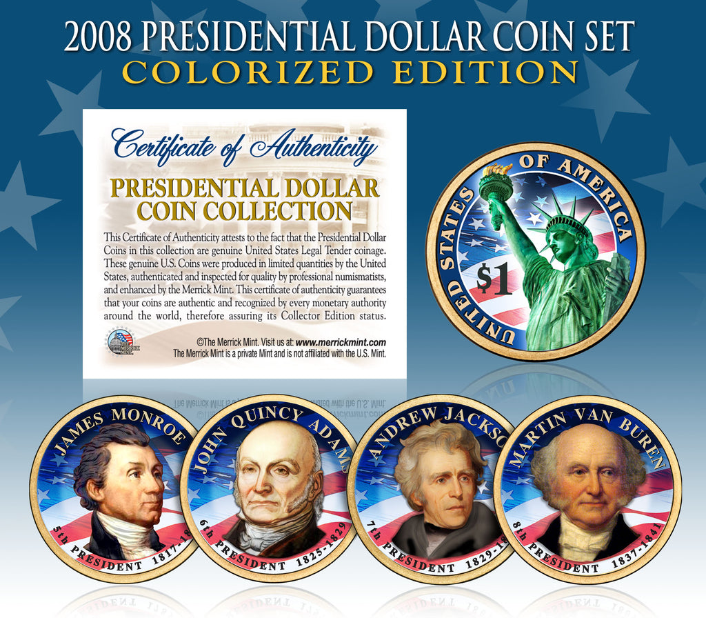 Here is your chance to own a complete set of four (4) beautifully colorized 2008 Presidential $1 U.S. Coins featuring four U.S. Presidents: Monroe, Adams, Jackson, Van Buren. Each coin is beautifully enhanced in permanent full-color by the Merrick Mint to highlight the original design using a unique colorizing process, which involves the application of special inks directly to the surface of a coin. The result is an everlasting colorized coin collectible of ultra-high quality that is #1 in the industry. Each coin features a common reverse design of the Statue of Liberty and a unique Presidential portrait design on the obverse. Each coin is genuine legal tender of the United States and comes in an acrylic coin holder and includes a Full Color 2-sided Certificate of Authenticity. The United States Mint issues four Presidential $1 Coins each year. These coins feature large, dramatic artwork and edge-incused inscriptions of the year of minting, or issuance, E PLURIBUS UNUM and the mint mark. The size, weight and metal composition of the Presidential $1 Coins are identical to that of the Native American $1 Coins.