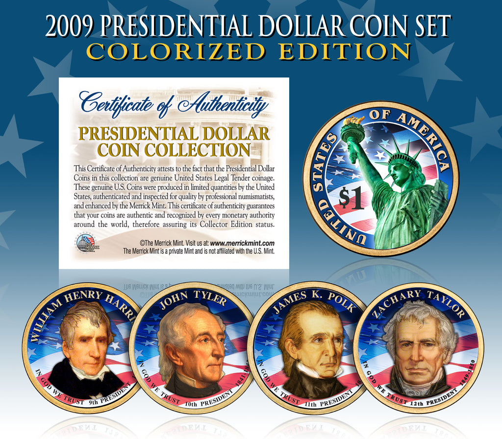 Here is your chance to own a complete set of four (4) beautifully colorized 2009 Presidential $1 U.S. Coins featuring four U.S. Presidents: Harrison, Tyler, Polk, Taylor. Each coin is beautifully enhanced in permanent full-color by the Merrick Mint to highlight the original design using a unique colorizing process, which involves the application of special inks directly to the surface of a coin. The result is an everlasting colorized coin collectible of ultra-high quality that is #1 in the industry. Each coin features a common reverse design of the Statue of Liberty and a unique Presidential portrait design on the obverse. Each coin is genuine legal tender of the United States and comes in an acrylic coin holder and includes a Full Color 2-sided Certificate of Authenticity. The United States Mint issues four Presidential $1 Coins each year. These coins feature large, dramatic artwork and edge-incused inscriptions of the year of minting, or issuance, E PLURIBUS UNUM and the mint mark. The inscription IN GOD WE TRUST appears on the face of the coins. The size, weight and metal composition of the Presidential $1 Coins are identical to that of the Native American $1 Coins.