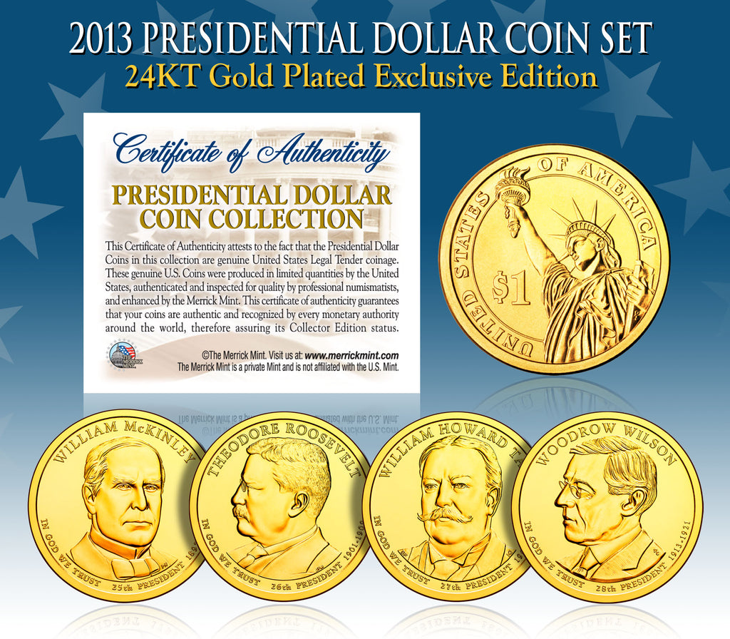 Here is your chance to own a complete set of four (4) 24KT Gold Plated 2013 Presidential $1 U.S. Coins featuring four U.S. Presidents: W. McKinley, T. Roosevelt, W.H. Taft, W. Wilson. Each coin is 24KT Gold Plated by the Merrick Mint to highlight the original design using a unique authentic process. The result is an everlasting 24KT Gold Plated coin collectible of ultra-high quality that is #1 in the industry. Each coin features a common reverse design of the Statue of Liberty and a unique Presidential portrait design on the obverse. Each coin is genuine legal tender of the United States and comes in an acrylic coin holder and includes a Full Color 2-sided Certificate of Authenticity. The United States Mint issues four Presidential $1 Coins each year. These coins feature large, dramatic artwork and edge-incused inscriptions of the year of minting, or issuance, E PLURIBUS UNUM and the mint mark. The inscription IN GOD WE TRUST appears on the face of the coins. The size, weight and metal composition of the Presidential $1 Coins are identical to that of the Native American $1 Coins.