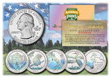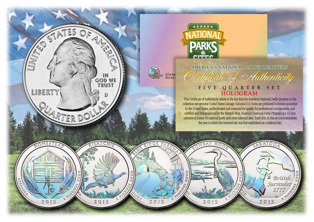 Here is your chance to own a complete set of five (5) hologram enhanced 2015 America the Beautiful Quarters U.S. Coins featuring five national sites. Each coin is beautifully enhanced on the reverse with a permanent hologram by the Merrick Mint to highlight the original design using a unique authentic process. The result is an everlasting hologram coin collectible of ultra-high quality that is #1 in the industry. Each coin features a common obverse with portrait of George Washington without hologram. Each coin is genuine legal tender of the United States and comes in an acrylic coin holder and includes a Full Color 2-sided Certificate of Authenticity.