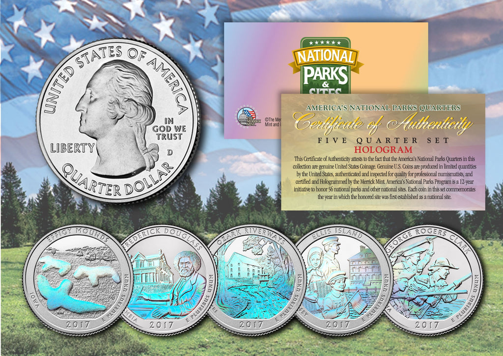 Here is your chance to own a complete set of five (5) hologram enhanced 2017 America the Beautiful Quarters U.S. Coins featuring five national sites. Each coin is beautifully enhanced on the reverse with a permanent hologram by the Merrick Mint to highlight the original design using a unique authentic process. The result is an everlasting hologram coin collectible of ultra-high quality that is #1 in the industry. Each coin features a common obverse with portrait of George Washington without hologram. Each coin is genuine legal tender of the United States and comes in an acrylic coin holder and includes a Full Color 2-sided Certificate of Authenticity.