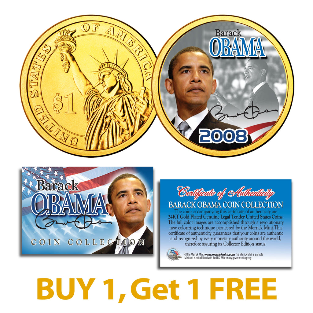 Buy one and get one FREE! Barack Obama is the 44th President of the United States. Here is your opportunity to own or to giftthe “BARACK OBAMA - 2008” colorized 24 Karat Gold Plated Inaugural George Washington 2007 Presidential $1 U.S. Coin, which has been layered in Genuine 24 Karat Gold, and then beautifully enhanced with colorized images by the Merrick Mint. Each coin comes in a premium coin capsule with a full color Certificate of Authenticity to guarantee that your coin is authentic and recognized by every monetary authority around the world, assuring its Collector Edition status. This Legal Tender United States coin has been colorized with an application of special inks directly to the surface of the coin,using a unique and painstakingly multicolor coin process, which achieves a level of detail, color saturation, and durability that is #1 in the coin industry. The result is an everlasting colorized coin collectible of ultra-high quality. The inaugural George Washington 2007 Presidential $1 U.S. Coin features a Statue of Liberty design on the reverse and a George Washington portrait design on the obverse.