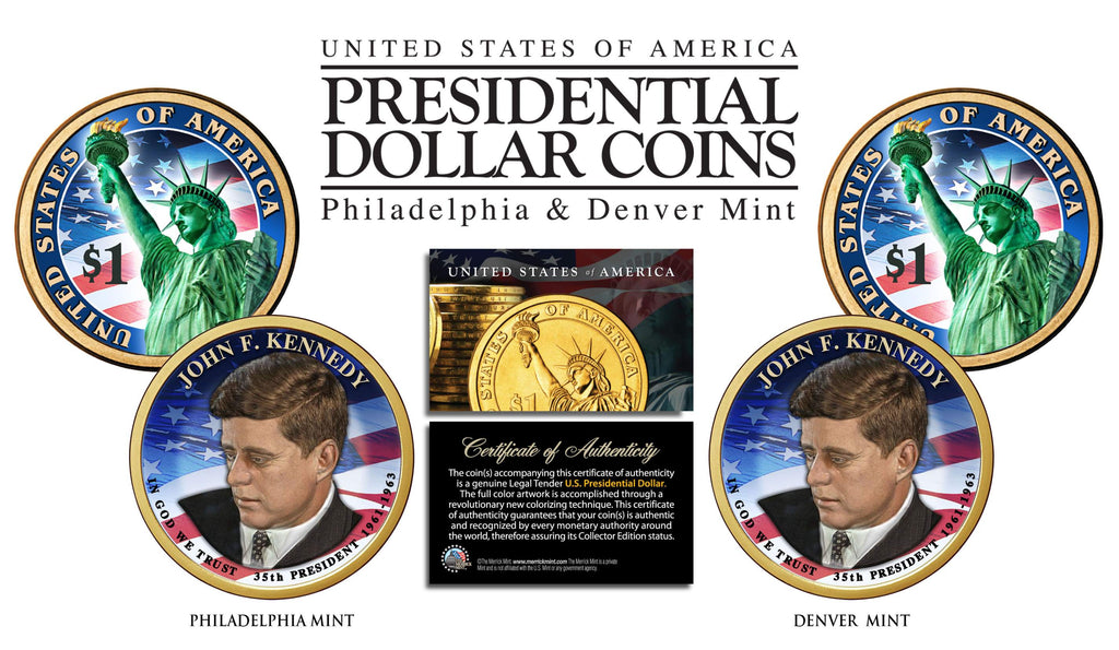 This Colorized 2015 JOHN F. KENNEDY Presidential $1 Dollar US 2-Coin Set includes both Philadelphia and Denver Mintage. To highlight the original design, the Merrick Mint has beautifully colorized both the obverse side and reverse side of each coin. Each coin comes in a premium coin capsule. The 2-coin set comes with a Certificate of Authenticity to guarantee that your coins are authentic and recognized by every monetary authority around the world, assuring its Collector Edition status. These Legal Tender United States coin has been colorized with an application of special inks directly to the surface of the coin, using a unique and painstakingly multicolor coin process, which achieves a level of detail, color saturation, and durability that is #1 in the coin industry. The result is an everlasting colorized coin collectible of ultra-high quality. The John F. Kennedy 2015 Presidential $1 U.S. Coin features a Statue of Liberty design on the reverse and a John F. Kennedy design on the obverse.