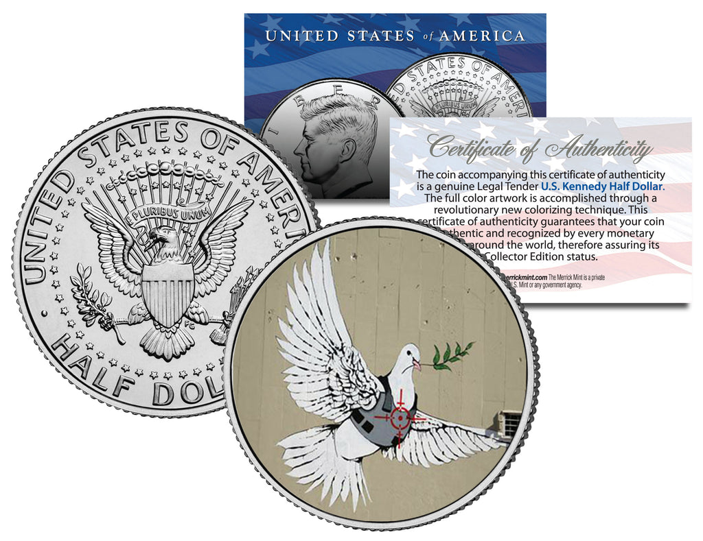 Here is your opportunity to own or to gift the BANKSY - ARMORED DOVE OF PEACE colorized JFK Kennedy Half Dollar U.S. Coin, which has been enhanced with a beautifully colorized image by the Merrick Mint. Each coin comes in a premium coin capsule with a full color Certificate of Authenticity to guarantee that your coin is authentic and recognized by every monetary authority around the world, assuring its Collector Edition status. This Legal Tender United States coin has been colorized with an application of special inks directly to the surface of the coin, using a unique and painstakingly multicolor coin process, which achieves a level of detail, color saturation, and durability that is #1 in the coin industry. The result is an everlasting colorized coin collectible of ultra-high quality.