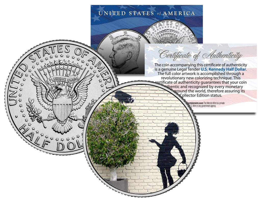 Here is your opportunity to own or to gift the BANKSY - FLOWER GIRL colorized JFK Kennedy Half Dollar U.S. Coin, which has been enhanced with a beautifully colorized image by the Merrick Mint. Each coin comes in a premium coin capsule with a full color Certificate of Authenticity to guarantee that your coin is authentic and recognized by every monetary authority around the world, assuring its Collector Edition status. This Legal Tender United States coin has been colorized with an application of special inks directly to the surface of the coin, using a unique and painstakingly multicolor coin process, which achieves a level of detail, color saturation, and durability that is #1 in the coin industry. The result is an everlasting colorized coin collectible of ultra-high quality.