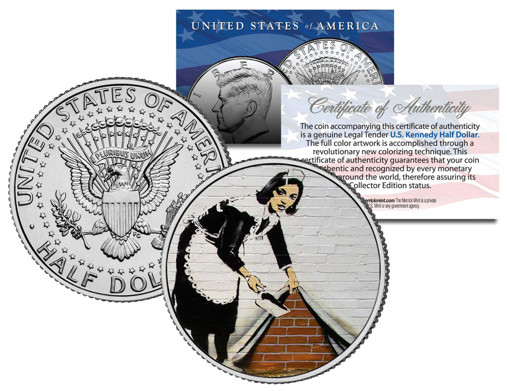 Here is your opportunity to own or to gift the BANKSY - MAID IN LONDON colorized JFK Kennedy Half Dollar U.S. Coin, which has been enhanced with a beautifully colorized image by the Merrick Mint. Each coin comes in a premium coin capsule with a full color Certificate of Authenticity to guarantee that your coin is authentic and recognized by every monetary authority around the world, assuring its Collector Edition status. This Legal Tender United States coin has been colorized with an application of special inks directly to the surface of the coin, using a unique and painstakingly multicolor coin process, which achieves a level of detail, color saturation, and durability that is #1 in the coin industry. The result is an everlasting colorized coin collectible of ultra-high quality.