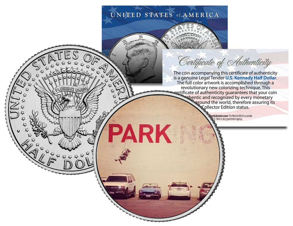 Here is your opportunity to own or to gift the BANKSY - PARKING GIRL SWING colorized JFK Kennedy Half Dollar U.S. Coin, which has been enhanced with a beautifully colorized image by the Merrick Mint. Each coin comes in a premium coin capsule with a full color Certificate of Authenticity to guarantee that your coin is authentic and recognized by every monetary authority around the world, assuring its Collector Edition status. This Legal Tender United States coin has been colorized with an application of special inks directly to the surface of the coin, using a unique and painstakingly multicolor coin process, which achieves a level of detail, color saturation, and durability that is #1 in the coin industry. The result is an everlasting colorized coin collectible of ultra-high quality.