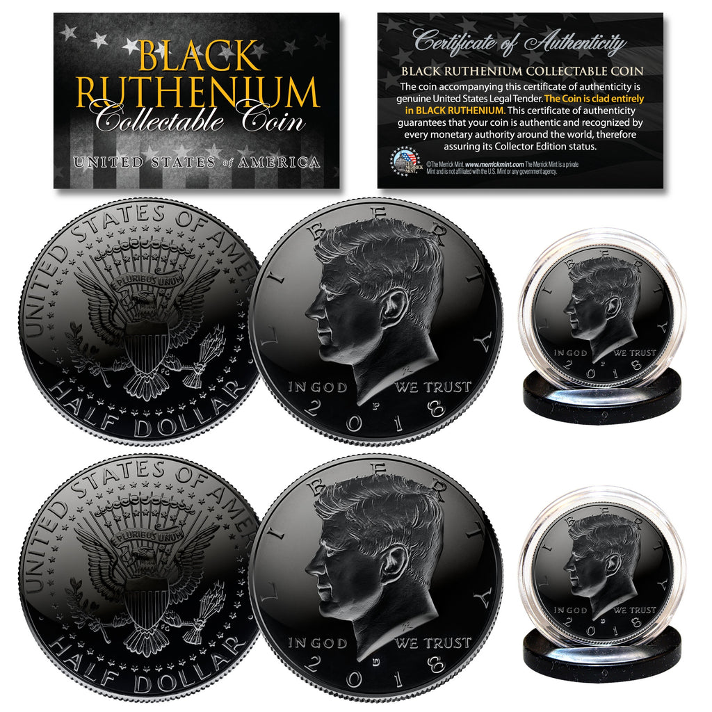 Here is your chance to own the first ever complete BLACK RUTHENIUM EDITION 2018 JFK Kennedy Half Dollar U.S. Coins. This Black Ruthenium 2018 JFK Kennedy Half Dollar U.S. 2-Coin Set includes both Philadelphia and Denver Mintage. To highlight the original coin design, the Merrick Mint clad each coin entirely in Black Ruthenium. Black Ruthenium is a type of platinum metal that looks like a dark platinum, but is 100 times Rarer. Ruthenium is a chemical element with the symbol RU & Atomic # 44. It is a rare transition metal belonging to the platinum group of the periodic table. Each coin comes in a premium coin capsule with a Certificate of Authenticity to guarantee that your coin is authentic and recognized by every monetary authority around the world, assuring its Collector Edition status.