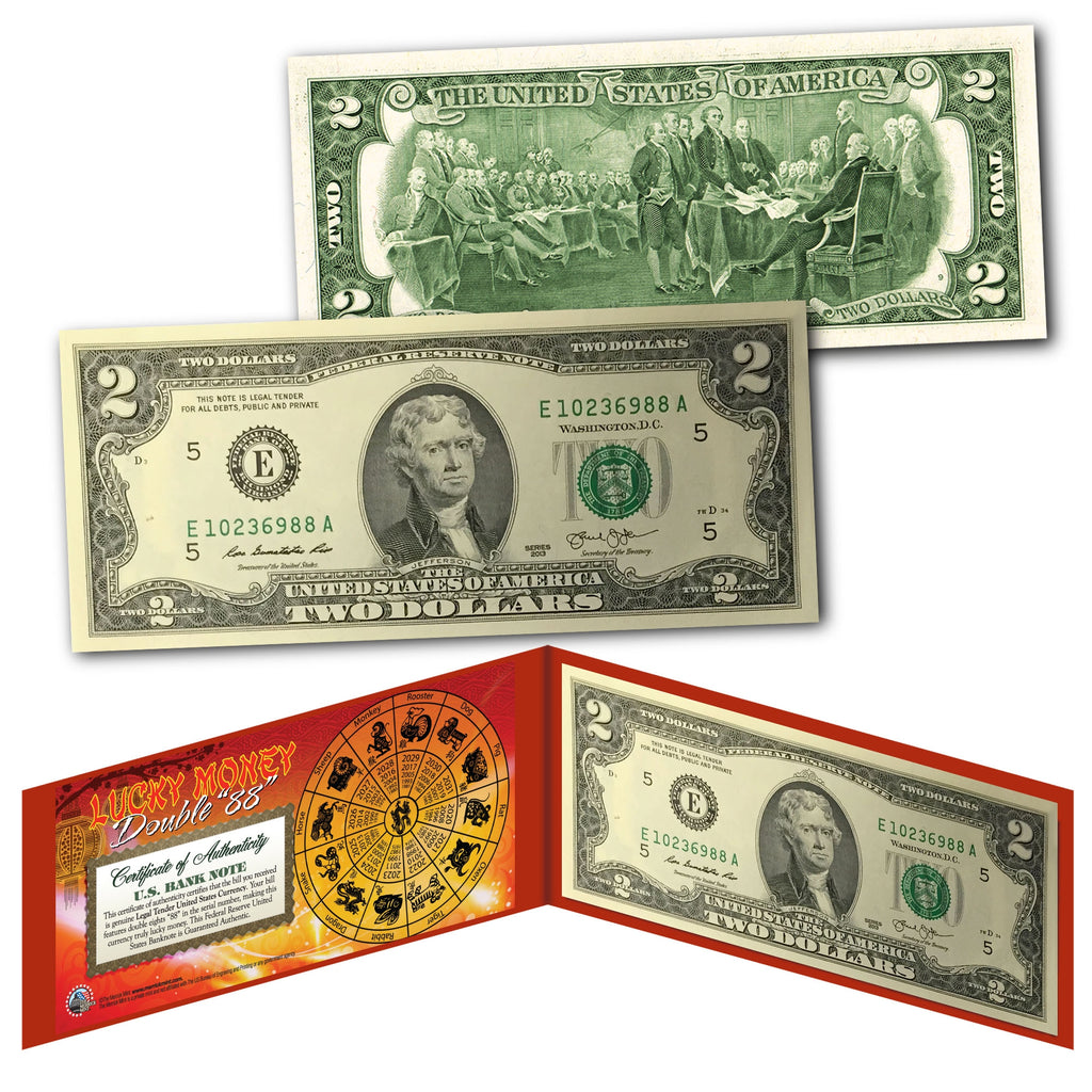 Straight from the Federal Reserve, this Authentic Two-Dollar Bill has never been touched and is in Mint Condition. What makes this $2 Bill so Unique and Special is that it contains DOUBLE 8’s (88) in the Serial Number. Number 8 symbolizes fortune and good luck in Chinese and Asian culture. Each $2 Bill is in FRESH, CRISP, UNCIRCULATED condition, and was directly removed from untouched wrapped Federal Reserve sealed packs. Included is a Certificate of Authenticity to guarantee that your bills are authentic and recognized by every monetary authority around the world, and assuring its Collector Edition status. The $2 Lucky Double "88" product consists of a Red Display Folio, with embossed gold foil holding a $2 Federal Reserve note inside that has a serial number containing “88.”
