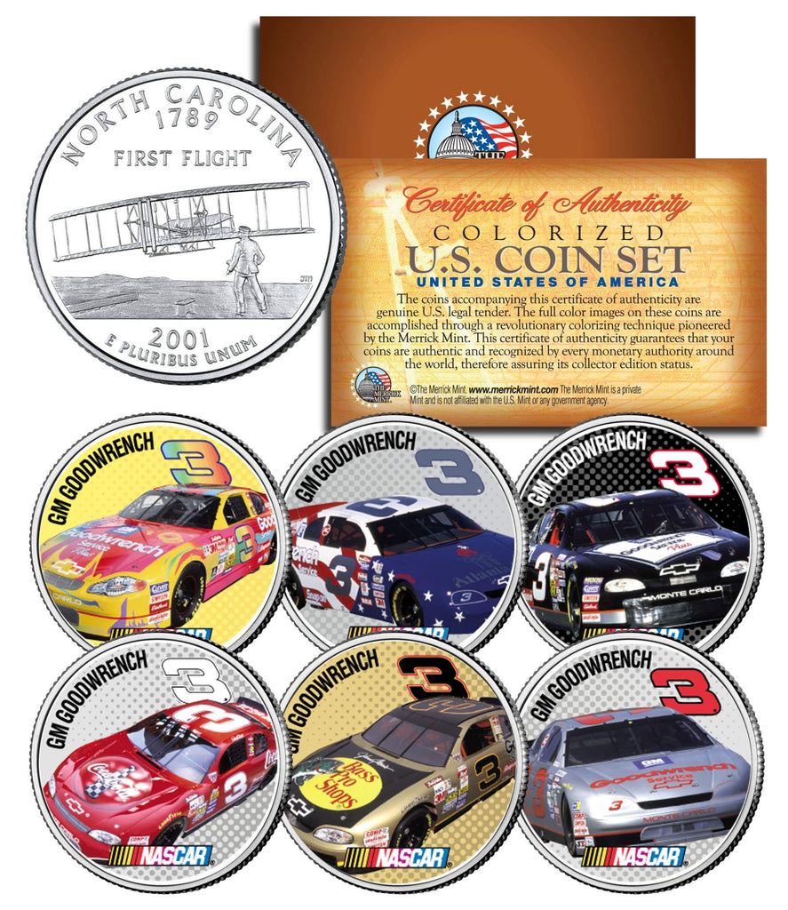 Here is your chance to own a Dale Earnhardt complete set of six (6) colorized 2001 North Carolina Statehood Quarters U.S. Coins featuring 6 of Dale Earnhardt’s GM GOODWRENCH #3 race cars. These high-quality, genuine Legal Tender United States coins have been colorized using a unique painstaking multicolor authentic process by the Merrick Mint. Colorizing coins involves the unique application of special inks directly to the surface of a coin that achieves a level of detail, color saturation, and durability that is #1 in the coin industry. The result is an everlasting colorized coin collectible of ultra-high quality. Each coin features an emblematic design of North Carolina State on the reverse and colorized images of Dale Earnhardt’s race cars on the obverse (portrait of George Washington design). Each coin comes in a premium coin capsule and the set comes with a Certificate of Authenticity to guarantee that your coins are authentic and recognized by every monetary authority around the world, assuring its Collector Edition status.