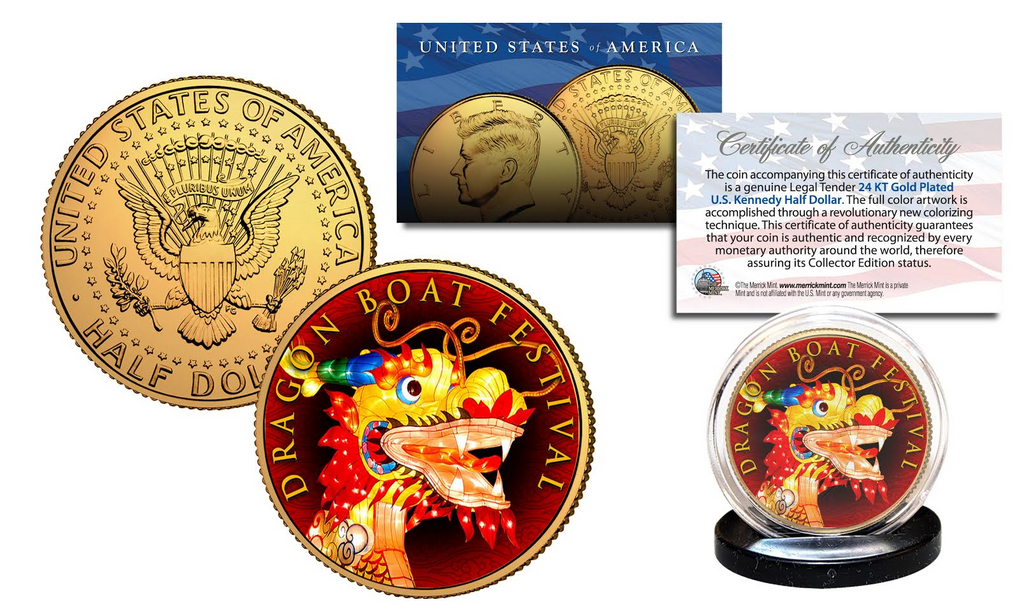 This DRAGON BOAT FESTIVAL COIN is lucky money and a treasured collectible. Here is your chance to own or gift a beautifully colorized 24KT Gold Plated JFK Kennedy Half Dollar U.S. Coin. This high-quality genuine Legal Tender U.S. coin has been has been layered in Genuine 24 Karat Gold, and then enhanced with beautiful colorized images using a unique painstaking multicolor authentic process. Colorizing coins involves the unique application of special inks directly to the surface of a coin that achieves a level of detail, color saturation, and durability that is #1 in the coin industry. The result is an everlasting colorized coin collectible of ultra-high quality. Each coin comes in a premium coin capsule with a Certificate of Authenticity to guaranty that your coin is authentic and recognized by every monetary authority around the world, assuring its Collector Edition status.