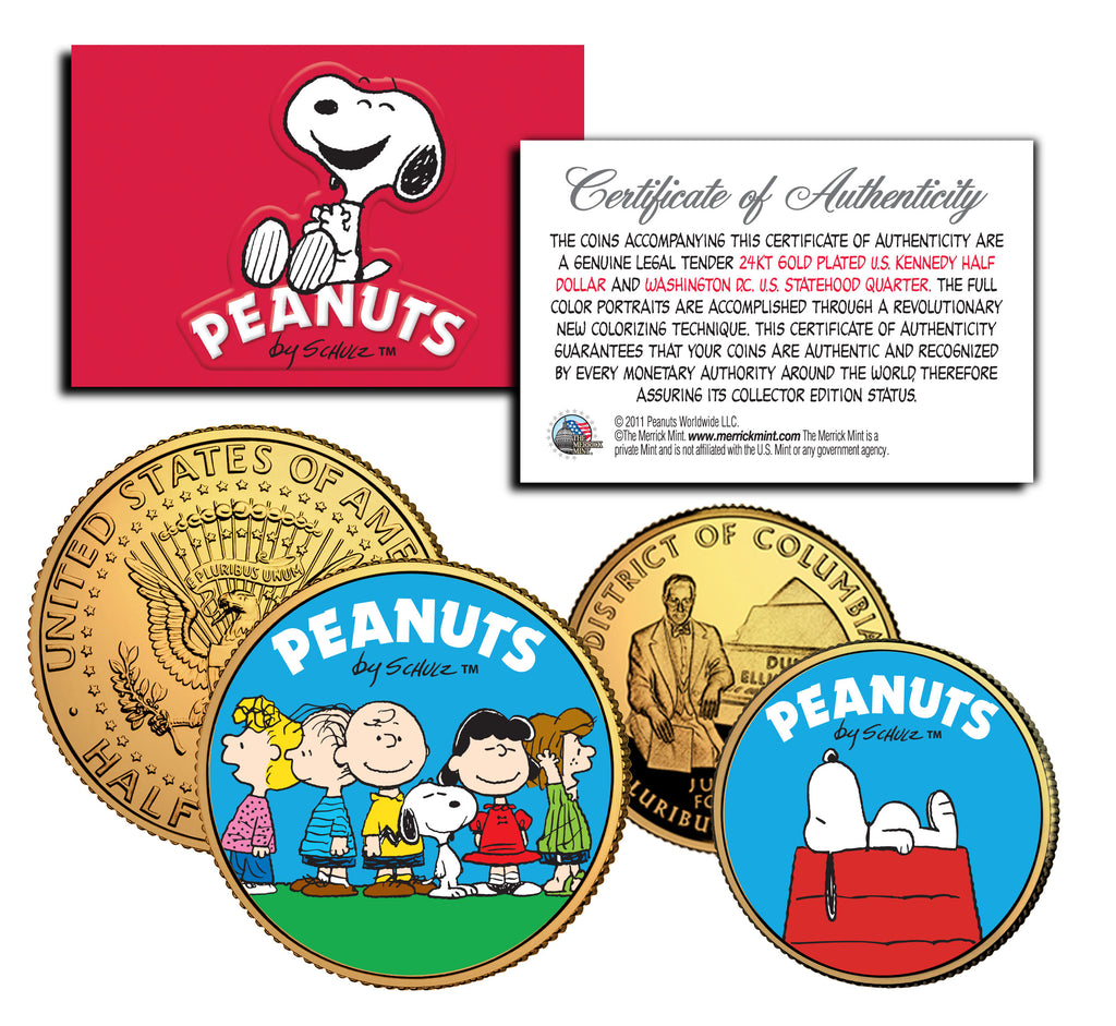 This Officially Licensed PEANUTS 2-coin complete set is a treasured collectible, combining the popularity of the PEANUTS with coin collecting. Coins are Genuine Authentic Legal Tender of the United States, which have been layered in Genuine 24 Karat Gold, and then beautifully enhanced with colorized images. The 2-coin set includes a 24-Karat Gold Plated JFK Kennedy Half Dollar coin with a colorized image of the Peanuts Original Gang plus a 24-Karat Gold Plated 2009 District of Columbia quarter with a colorized image of Snoopy on Doghouse. Colorizing coins involves the unique application of special inks directly to the surface of a coin that achieves a level of detail, color saturation, and durability that is #1 in the coin industry. The result is an everlasting colorized coin collectible of ultra-high quality. Each coin comes in a premium coin capsule. The set comes with a Certificate of Authenticity to guarantee that your coins are authentic and recognized by every monetary authority around the world, assuring its Collector Edition status.