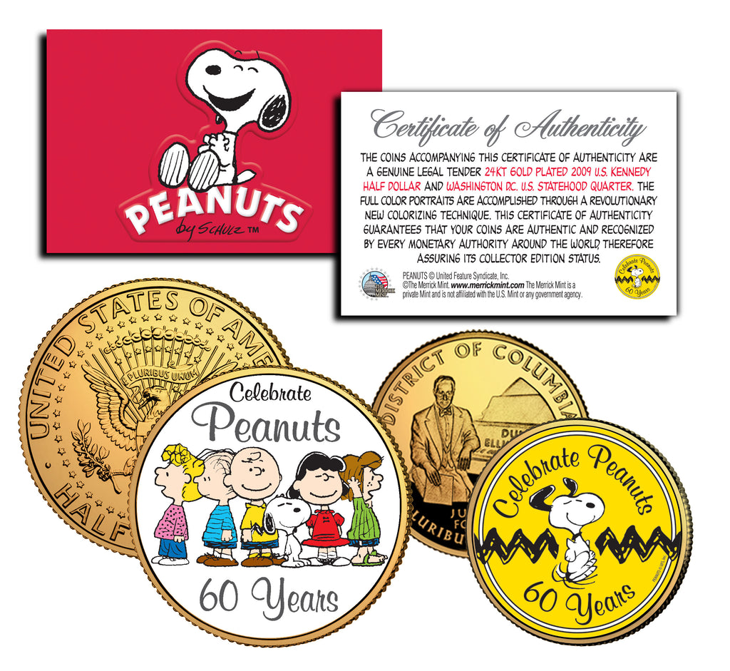 This Officially Licensed CELEBRATE PEANUTS 60 YEARS 2-coin complete set is a treasured collectible, combining the popularity of the PEANUTS with coin collecting. Coins are Genuine Authentic Legal Tender of the United States, which have been layered in Genuine 24 Karat Gold, and then beautifully enhanced with colorized images. The 2-coin set includes a 24-Karat Gold Plated JFK Kennedy Half Dollar coin with a colorized image of the Peanuts Original Gang plus a 24-Karat Gold Plated 2009 District of Columbia quarter with a colorized image of Snoopy Dancing. Colorizing coins involves the unique application of special inks directly to the surface of a coin that achieves a level of detail, color saturation, and durability that is #1 in the coin industry. The result is an everlasting colorized coin collectible of ultra-high quality. Each coin comes in a premium coin capsule. The set comes with a Certificate of Authenticity to guarantee that your coins are authentic and recognized by every monetary authority around the world, assuring its Collector Edition status.