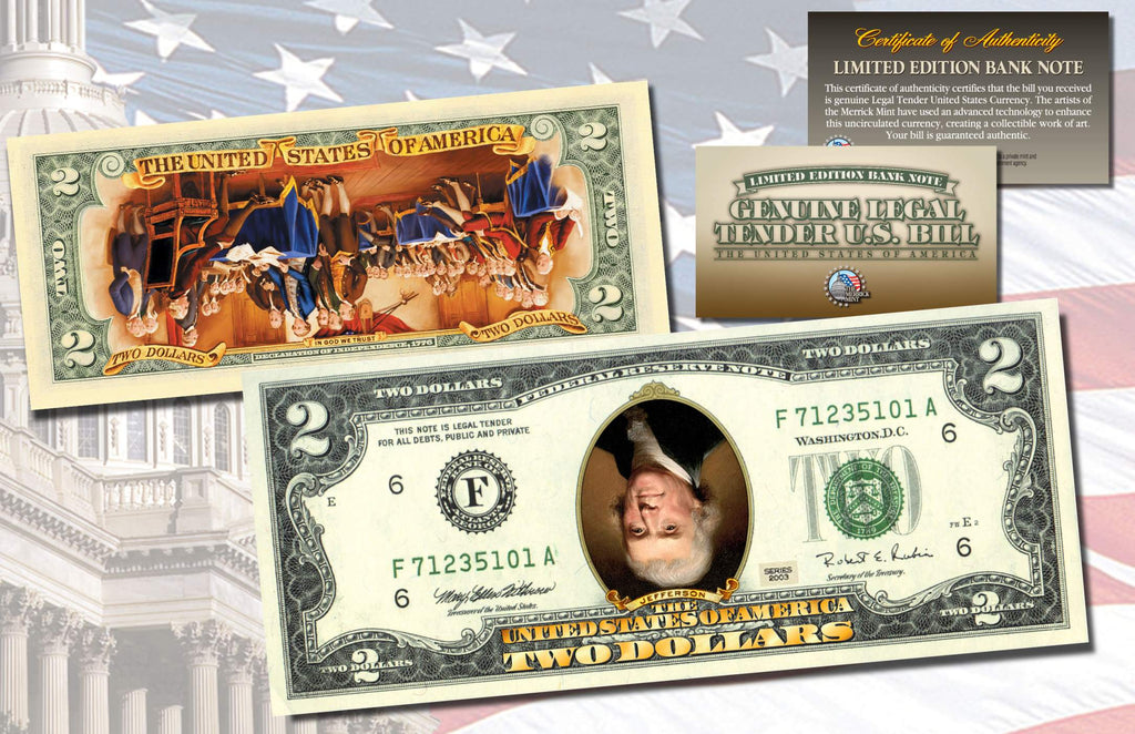 This is a one-of-a-kind Banknote. For the first time ever, you can own a 2-Sided UPSIDE DOWN Genuine Legal Tender Colorized $2 Bill. Inverted Stamps and Currency have recently sold in auctions for Millions and Millions of Dollars. The Inverted/Upside Down Currency and Stamps are very RARE! Now you can own a genuine colorized Inverted/Upside Down U.S. 2-Sided $2 Banknote featuring THOMAS JEFFERSON UPSIDE DOWN and the SIGNING OF THE DECLARATION OF INDEPENDENCE UPSIDE DOWN. This bill is so unique that it is the only one of it’s a kind out there. This uncirculated $2 Bill is genuine Legal Tender of the United States which has been color enhanced by the Merrick Mint using a specialized advanced technology creating a collectible work of art. The vivid color enhancements to the portrait of Thomas Jefferson (obverse) and the Signing of the Declaration of Independence by John Trumbull (reverse) bring the bill’s original artwork to life. This bill is in Fresh, Crisp, Uncirculated condition and comes displayed in a clear acrylic holder which is viewable on both sides and a certificate of authenticity. It is the only U.S. Currency note that features two Presidents, John Adams and Thomas Jefferson, and it is one of the most rarely seen BILLS in circulation and actual use.