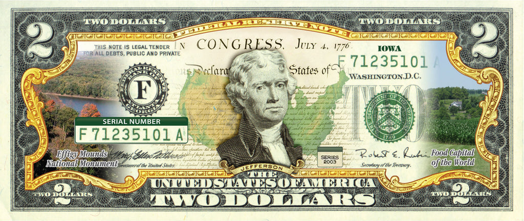 This IOWA State uncirculated Two-Dollar Bill is Genuine Legal Tender of the United States, which has been enhanced with beautiful iconic images of the State. The colorized images are accomplished through a revolutionary new authentic & genuine colorization process pioneered by The Merrick Mint, creating a collectible work of art. Additionally, The Merrick Mint has applied three unique security features to the bill using a special C-Thru technology including: bell in the inkwell, the feather quill, and vertical ribbon. Included is a blue display portfolio plus a Certificate of Authenticity to guaranty that your bill is authentic and recognized by every monetary authority around the world, and assuring its Collector Edition status. Only genuine Legal Tender $2 United States Bills are used for this unique colorization process. Each $2 Bill is in FRESH, CRISP, UNCIRCULATED condition, and was directly removed from untouched wrapped Federal Reserve sealed packs. Former U.S. President Thomas Jefferson is featured on the obverse of the note, along with the special colorization overlay. The Signing of the Declaration of Independence by John Trumbull is featured on the reverse. It is the only U.S. Currency note that features two Presidents, John Adams and Thomas Jefferson, and it is one of the most rarely seen BILLS in circulation and actual use.