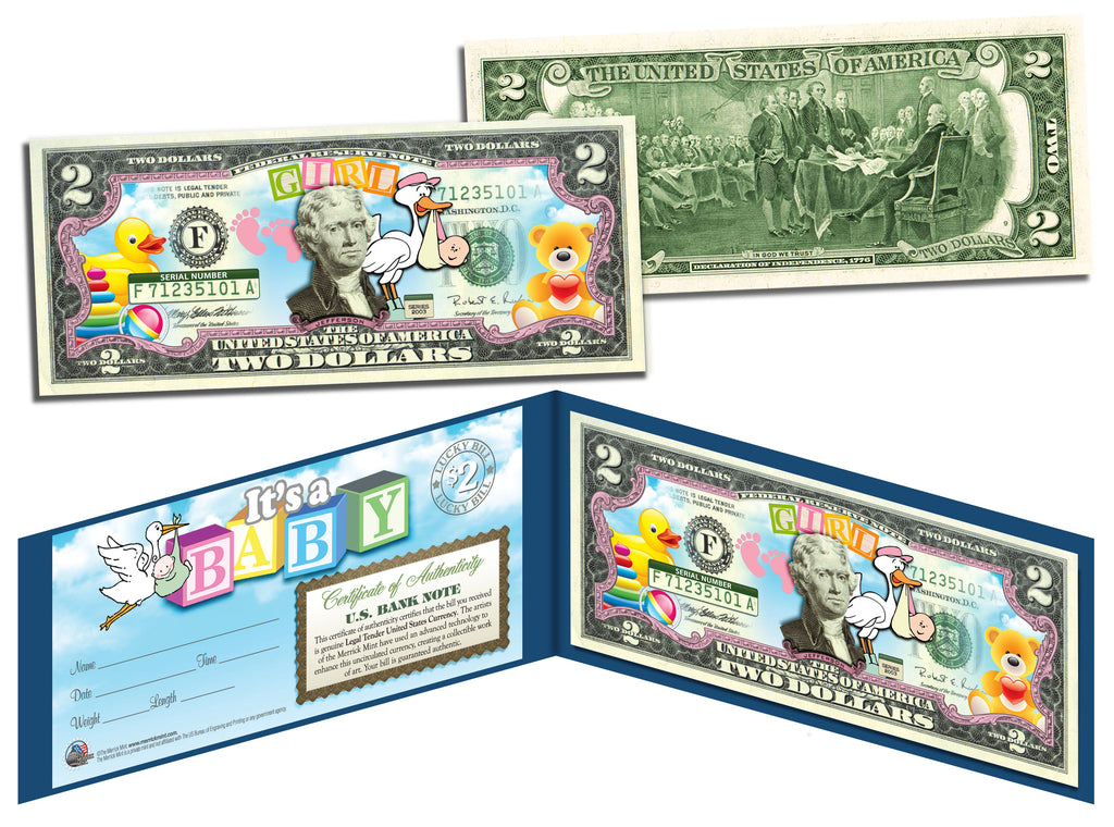 This IT’S A BABY GIRL uncirculated $2 Bill is Genuine Authentic Legal Tender of the United States, which has been enhanced with beautiful colorized images. The full colorized images are accomplished through a revolutionary new authentic & genuine colorization process pioneered by The Merrick Mint, creating a collectible work of art. Each bill comes displayed in a blue folio with a Certificate of Authenticity to guarantee that your bills are authentic and recognized by every monetary authority around the world, therefore assuring its Collector Edition status. Each $2 Bill is in FRESH, CRISP, UNCIRCULATED condition, and was directly removed from untouched wrapped Federal Reserve sealed packs. Former U.S. President Thomas Jefferson is featured on the obverse of the note, along with the special colorization overlay. The Signing of the Declaration of Independence by John Trumbull is featured on the reverse. It is the only U.S. Currency note that features two Presidents, John Adams and Thomas Jefferson, and it is one of the most rarely seen BILLS in circulation and actual use.