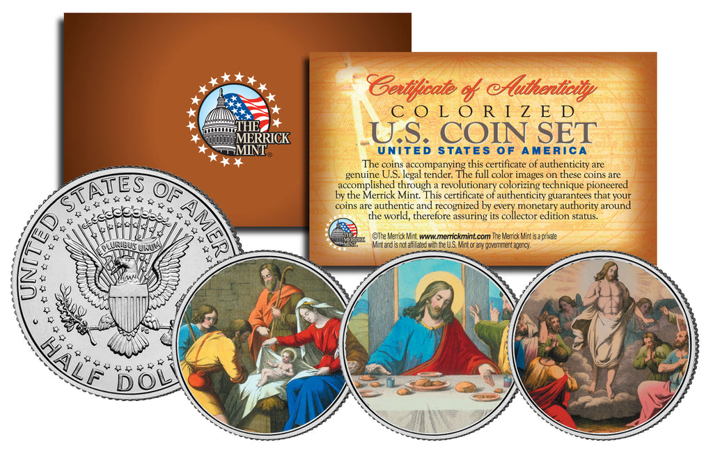 Here is your chance to own a complete set of three (3) colorized JFK Kennedy Half Dollar U.S. Coins of JESUS CHRIST. The 3-coin set includes: a “JESUS CHRIST – NATIVITY” coin, a “JESUS CHRIST – LAST SUPPER” coin, and a “JESUS CHRIST - RESURRECTION” coin. These high-quality, genuine Legal Tender United States coins have been colorized using a unique painstaking multicolor authentic process by the Merrick Mint. Colorizing coins involves the unique application of special inks directly to the surface of a coin that achieves a level of detail, color saturation, and durability that is #1 in the coin industry. The result is an everlasting colorized coin collectible of ultra-high quality. Each coin comes in a premium coin capsule. The 3-coin set comes with a Certificate of Authenticity to guarantee that your coins are authentic and recognized by every monetary authority around the world, assuring its Collector Edition status. The Kennedy half dollar is a U.S. fifty cent coin with coin year and mint marks chosen at random.