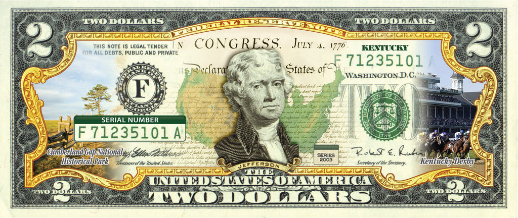 This KENTUCKY State uncirculated Two-Dollar Bill is Genuine Legal Tender of the United States, which has been enhanced with beautiful iconic images of the State. The colorized images are accomplished through a revolutionary new authentic & genuine colorization process pioneered by The Merrick Mint, creating a collectible work of art. Additionally, The Merrick Mint has applied three unique security features to the bill using a special C-Thru technology including: bell in the inkwell, the feather quill, and vertical ribbon. Included is a blue display portfolio plus a Certificate of Authenticity to guaranty that your bill is authentic and recognized by every monetary authority around the world, and assuring its Collector Edition status. Only genuine Legal Tender $2 United States Bills are used for this unique colorization process. Each $2 Bill is in FRESH, CRISP, UNCIRCULATED condition, and was directly removed from untouched wrapped Federal Reserve sealed packs. Former U.S. President Thomas Jefferson is featured on the obverse of the note, along with the special colorization overlay. The Signing of the Declaration of Independence by John Trumbull is featured on the reverse. It is the only U.S. Currency note that features two Presidents, John Adams and Thomas Jefferson, and it is one of the most rarely seen BILLS in circulation and actual use.