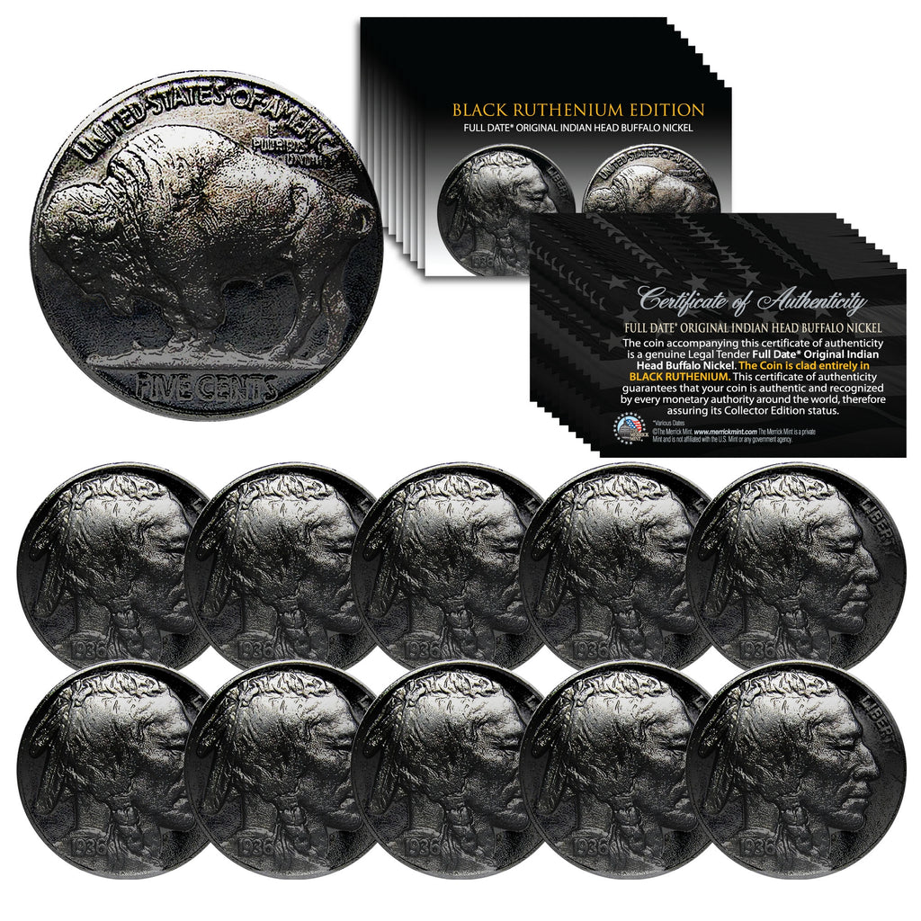 Here is your chance to own a lot of ten (10) BLACK RUTHENIUM U.S. Buffalo nickels with full date and of various years (1913-1938). To highlight the original coin design, the Merrick Mint has clad the coin entirely in Black Ruthenium. Black Ruthenium is a type of platinum metal that looks like a dark platinum, but is 100 times Rarer. Ruthenium is a chemical element with the symbol RU & Atomic # 44. It is a rare transition metal belonging to the platinum group of the periodic table. Each coin comes in a premium coin capsule with a Certificate of Authenticity to guarantee that your coin is authentic and recognized by every monetary authority around the world, assuring its Collector Edition status. The Buffalo nickel has a right profile of an American Indian design on the obverse and American Bison design on the reverse. The Buffalo nickel is a U.S. five-cent coin with coin year and mint marks chosen at random.