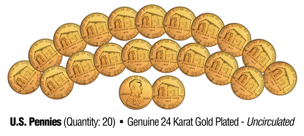 This first redesigned 2009 Lincoln penny in 50 years was launched on Feb. 12, 2009. The reverse design represents Lincoln's early life and humble beginnings in Kentucky from the years 1809-1816 and features the log cabin design symbolic of Abraham Lincoln's birthplace and childhood. Here is your chance to own a lot of twenty (20) 24KT Gold Plated uncirculated 2009 Lincoln Bicentennial “Birthplace” Pennies. Each genuine legal tender U.S. coin is 24KT Gold Plated by the Merrick Mint to highlight the original design using a unique authentic process. The result is an everlasting 24KT Gold Plated coin collectible of ultra-high quality that is #1 in the industry. Familiar President Lincoln bust design on the obverse.