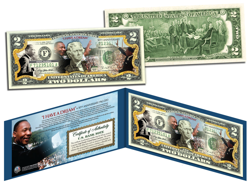 This uncirculated $2 Bill is Genuine Authentic Legal Tender of the United States, which has been enhanced with beautiful colorized images marking the 50th Anniversary of Martin Luther King’s “I Have a Dream” speech. The full colorized images are accomplished through a revolutionary new authentic & genuine colorization process pioneered by The Merrick Mint. Included is a Certificate of Authenticity to guaranty that your bills are authentic and recognized by every monetary authority around the world, and assuring its Collector Edition status. Only genuine Legal Tender $2 United States Bills are used for this unique colorization process. Each $2 Bill is in FRESH, CRISP, UNCIRCULATED condition, and was directly removed from untouched wrapped Federal Reserve sealed packs. Former U.S. President Thomas Jefferson is featured on the obverse of the note, along with the special colorization overlay. The Signing of the Declaration of Independence by John Trumbull is featured on the reverse. It is the only U.S. Currency note that features two Presidents, John Adams and Thomas Jefferson, and it is one of the most rarely seen BILLS in circulation and actual use.