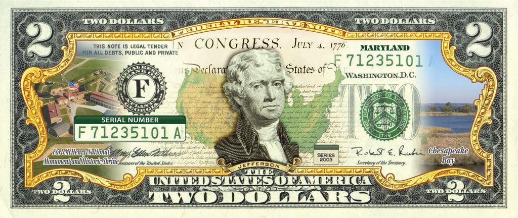 This MARYLAND State uncirculated Two-Dollar Bill is Genuine Legal Tender of the United States, which has been enhanced with beautiful iconic images of the State. The colorized images are accomplished through a revolutionary new authentic & genuine colorization process pioneered by The Merrick Mint, creating a collectible work of art. Additionally, The Merrick Mint has applied three unique security features to the bill using a special C-Thru technology including: bell in the inkwell, the feather quill, and vertical ribbon. Included is a blue display portfolio plus a Certificate of Authenticity to guaranty that your bill is authentic and recognized by every monetary authority around the world, and assuring its Collector Edition status. Only genuine Legal Tender $2 United States Bills are used for this unique colorization process. Each $2 Bill is in FRESH, CRISP, UNCIRCULATED condition, and was directly removed from untouched wrapped Federal Reserve sealed packs. Former U.S. President Thomas Jefferson is featured on the obverse of the note, along with the special colorization overlay. The Signing of the Declaration of Independence by John Trumbull is featured on the reverse. It is the only U.S. Currency note that features two Presidents, John Adams and Thomas Jefferson, and it is one of the most rarely seen BILLS in circulation and actual use.