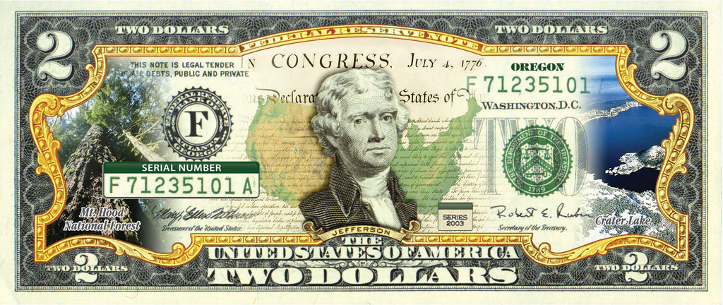 This OREGON State uncirculated Two-Dollar Bill is Genuine Legal Tender of the United States, which has been enhanced with beautiful iconic images of the State. The colorized images are accomplished through a revolutionary new authentic & genuine colorization process pioneered by The Merrick Mint, creating a collectible work of art. Additionally, The Merrick Mint has applied three unique security features to the bill using a special C-Thru technology including: bell in the inkwell, the feather quill, and vertical ribbon. Included is a blue display portfolio plus a Certificate of Authenticity to guaranty that your bill is authentic and recognized by every monetary authority around the world, and assuring its Collector Edition status. Only genuine Legal Tender $2 United States Bills are used for this unique colorization process. Each $2 Bill is in FRESH, CRISP, UNCIRCULATED condition, and was directly removed from untouched wrapped Federal Reserve sealed packs. Former U.S. President Thomas Jefferson is featured on the obverse of the note, along with the special colorization overlay. The Signing of the Declaration of Independence by John Trumbull is featured on the reverse. It is the only U.S. Currency note that features two Presidents, John Adams and Thomas Jefferson, and it is one of the most rarely seen BILLS in circulation and actual use.