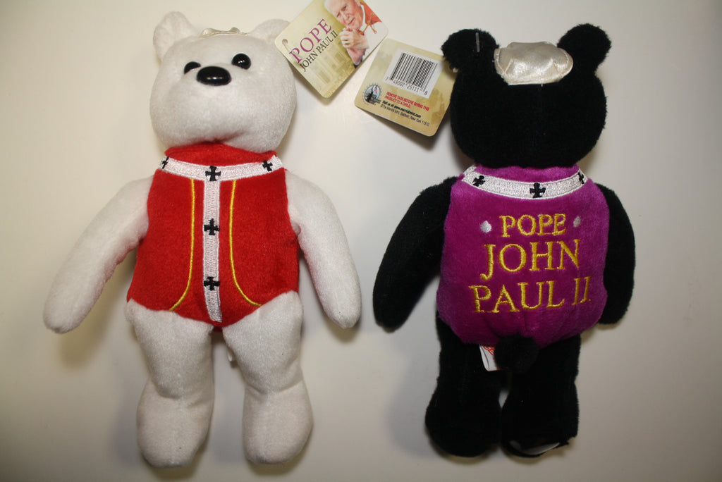 This pair of POPE JOHN PAUL II PLUSH BEARS each with the Canonization 24K Gold State Quarter are treasured collectibles. The 8” high 23 Karat Gold’n Bears Plush Bear is an exclusive design which is available nowhere else. Under the bear’s right foot, there is a clear pocket to display the Canonization coin which is exclusively sold with the bear. THE BUYER WILL RECEIVE TWO (2) BEARS AND TWO (2) COINS. The high-quality genuine Legal Tender 2001 New York Statehood Quarter U.S. coin has been layered in Genuine 24 Karat Gold, and then enhanced with a beautiful colorized image by the Merrick Mint. This Legal Tender United States coin has been colorized with an application of special inks directly to the surface of the coin, using a unique and painstakingly multicolor coin process, which achieves a level of detail, color saturation, and durability that is #1 in the coin industry. The result is an everlasting colorized coin collectible of ultra-high quality. Each Statehood Quarter coin features an emblematic design of New York State on the reverse and a colorized image of Pope John Paul II on the obverse (portrait of George Washington design). Each coin comes in a premium coin capsule with a Certificate of Authenticity to guarantee that your coin is authentic and recognized by every monetary authority around the world, assuring its Collector Edition status.