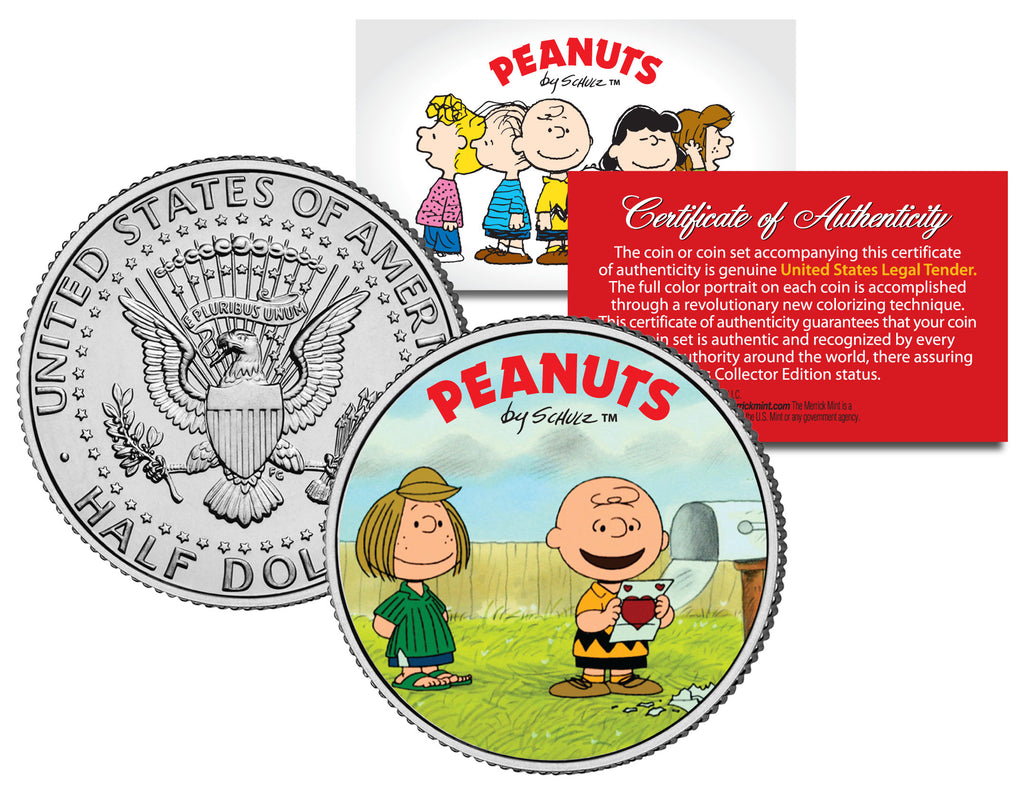 Here is your opportunity to own or gift the “PEANUTS VALENTINE’S – CHARLIE BROWN & PEPPERMINT PATTY” colorized JFK Kennedy Half Dollar U.S. Coin, which has been enhanced with a beautifully colorized image by the Merrick Mint. Each coin comes in a premium coin capsule with a full color Certificate of Authenticity to guarantee that your coin is authentic and recognized by every monetary authority around the world. This Legal Tender United States coin has been colorized with an application of special inks directly to the surface of the coin, using a unique and painstakingly multicolor coin process, which achieves a level of detail, color saturation, and durability that is #1 in the coin industry. The result is an everlasting colorized coin collectible of ultra-high quality. The Kennedy half dollar is a U.S. fifty cent coin with coin year and mint marks chosen at random.