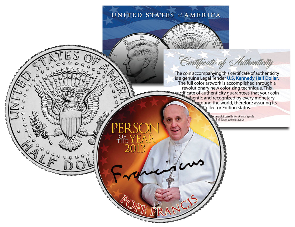 Pope Francis named PERSON OF THE YEAR 2013. This official high-quality genuine Legal Tender United States coin has been colorized using a unique painstaking multicolor authentic process. Colorizing coins involves the unique application of special inks directly to the surface of a coin that achieves a level of detail, color saturation, and durability that is #1 in the industry. The result is an everlasting colorized coin collectible of ultra-high quality. Each coin comes in a premium coin capsule with a Certificate of Authenticity. Pope Francis, born Jorge Mario Bergoglio on 17 December 1936, is the 266th and current Pope of the Roman Catholic Church, elected on March 13, 2013. As such, he is both head of the Church and sovereign of the Vatican City State. A native of Buenos Aires, Argentina, he was ordained as a priest in 1969. He served as head of the Society of Jesus in Argentina from 1973 to 1979. In 1998 he became the Archbishop of Buenos Aires, and in 2001 a cardinal. Following the resignation of his predecessor, Pope Benedict XVI, on February 28, 2013, the conclave elected Bergoglio, who chose the papal name Francis in honor of Saint Francis of Assisi. Besides being the first Jesuit Pope, he is also the first to choose the name Francis, and the first from the Americas and the Southern Hemisphere. Here is your chance to own an OFFICIAL beautifully colorized JFK Kennedy Half Dollar U.S. Coin.