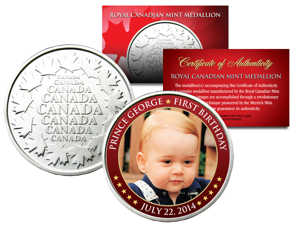 Here is your opportunity to own or gift the “PRINCE GEORGE - FIRST BIRTHDAY – July 22, 2014” colorized Royal Canadian Mint Medallion, which has been beautifully enhanced with colorized images by the Merrick Mint. Each medallion comes in a premium coin capsule with a full color Certificate of Authenticity. This medallion has been colorized with an application of special inks directly to the surface, using a unique and painstakingly multicolor process, which achieves a level of detail, color saturation, and durability that is #1 in the industry. Each medallion is about the same size as a U.S. Half Dollar coin and features a Canada Maple Leafs design on the reverse and a colorized Prince George image on the obverse.