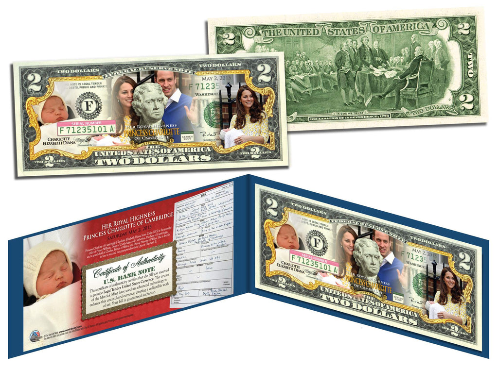 This PRINCESS CHARLOTTE OF CAMBRIDGE uncirculated $2 Bill is Genuine Authentic Legal Tender of the United States, which has been enhanced with beautiful colorized images commemorating her birth. The full colorized images are accomplished through a revolutionary new authentic & genuine colorization process pioneered by The Merrick Mint. Included is a Certificate of Authenticity to guarantee that your bills are authentic and recognized by every monetary authority around the world, and assuring its Collector Edition status. Only genuine Legal Tender $2 United States Bills are used for this unique colorization process. Each $2 Bill is in FRESH, CRISP, UNCIRCULATED condition, and was directly removed from untouched wrapped Federal Reserve sealed packs. Former U.S. President Thomas Jefferson is featured on the obverse of the note, along with the special colorization overlay. The Signing of the Declaration of Independence by John Trumbull is featured on the reverse. It is the only U.S. Currency note that features two Presidents, John Adams and Thomas Jefferson, and it is one of the most rarely seen BILLS in circulation and actual use.