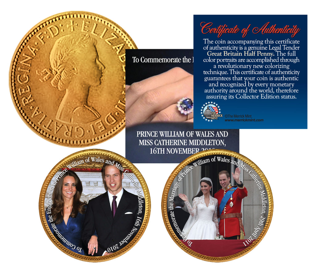 Here is your opportunity to own or gift the limited edition ROYAL WEDDING complete 2-coin set. This 2-coin set of colorized 24 Karat Gold Plated Great Britain Half Pennies coins are Genuine Authentic Legal Tender, which have been layered in Genuine 24 Karat Gold, and then beautifully enhanced by the Merrick Mint with colorized images of the engagement and wedding of Prince William, Duke of Cambridge and Catherine, Duchess of Cambridge. These high-quality genuine Legal Tender British coins have been colorized using a unique painstaking multicolor authentic process. Colorizing coins involves the unique application of special inks directly to the surface of a coin that achieves a level of detail, color saturation, and durability that is #1 in the industry. The result is an everlasting colorized coin collectible of ultra-high quality. The 2-coin set comes with Certificate of Authenticity to guaranty that your coins are authentic and recognized by every monetary authority around the world, assuring its Collector Edition status. Each coin comes in a premium coin capsule. The ROYAL WEDDING complete 2-coin set includes: coin “To commemorate the Engagement of Prince William of Wales and Miss Catherine Middleton, 16th November 2010” plus coin “To commemorate the Marriage of Prince William of Wales and Miss Catherine Middleton , 29th April 2011.” REGULAR PRICE of these 2-coins is $20.00. GREAT SAVINGS BY BUYING HERE NOW!!!